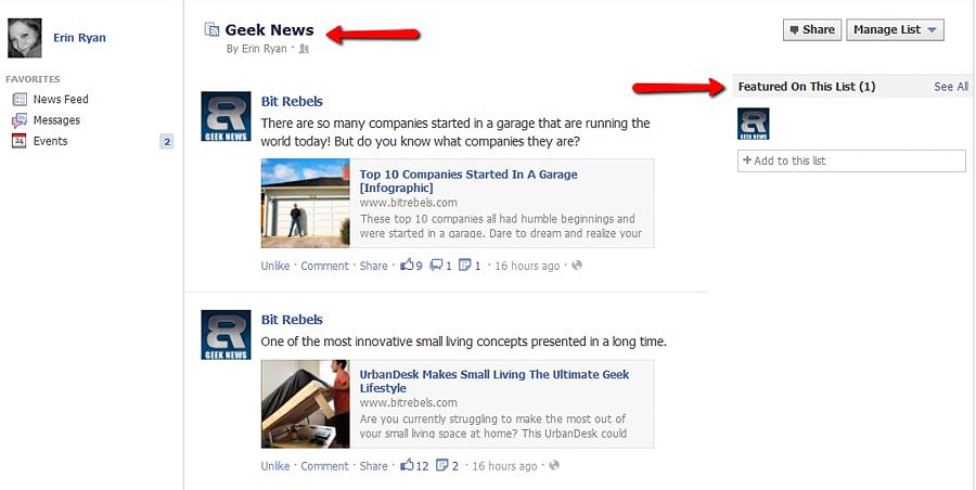 Businesses who use Facebook Pages will want to take a screenshot of the area in which people can add your page to their created lists on Facebook (Messages > Dropdown > Add to Interests) and along with it add a status update that is friendly, and even encouraging titles for a newly created list for your pages’ audience. You will extend your reach and help your page be seen more since people have chosen to add your page to the lists they are interested in.
