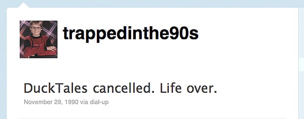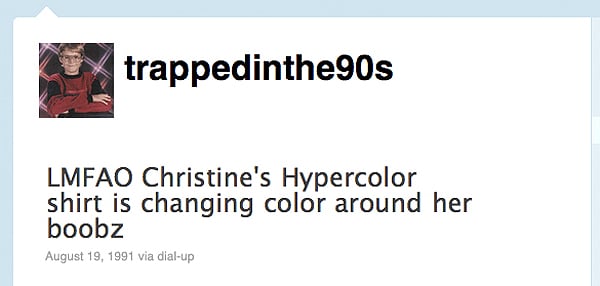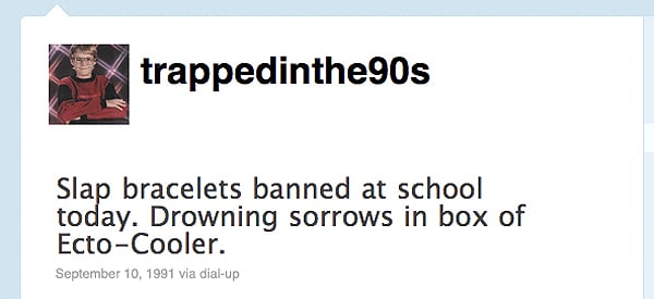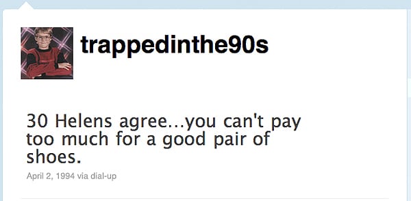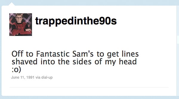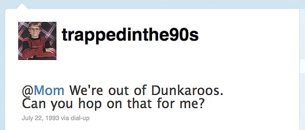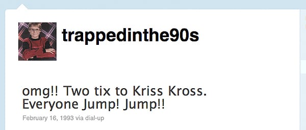 What if Twitter was around in the 90s? What if we could all go back and view our tweets from that time? What would we have tweeted about? The bloggers at pleated-jeans wondered this too, and they posted some possible tweets that we might have seen back then. This is so much fun! I wish they would do this again with tweets from the ’80s. Mine would probably read, “I just got the high score on Pac-Man. Schweeeeeet! Mom said I could play one more quarter.”