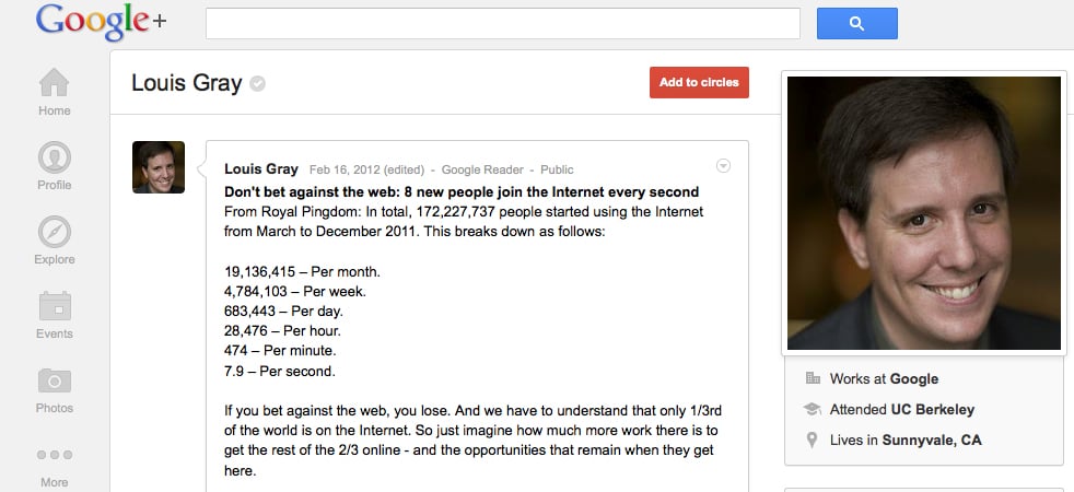 This infographic called The Internet: A Decade Later by BestEdSites.com not only provides some interesting stats when it comes to how our Internet habits have changed over the past ten years, but it also highlights how some companies have paid a steep price for being unwilling to adapt and grow with those changes. One thing is for sure, and that is our Internet use will continue to evolve, and it will look very different in ten years from now. I put a screenshot below of a Google+ post by Google’s Louis Gray from February of this year. It shows how many new users the Internet is adding every second of the day. As he says, if you bet against the web, you’ll lose. How have your Internet habits changed over the years?