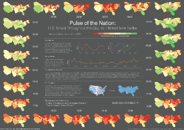 The time-lapse video below shoes the mood in the States as inferred using over 300 million tweets over the course of the day. The maps are represented using density-preserving cartograms.