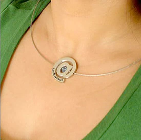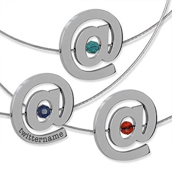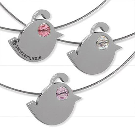 Your Twitter username can be engraved on whichever one of these you choose. A colored Swarovski crystal decorates each one to add a little sparkle. I would guess most people choose the color crystal of their birthstone, but I would choose the blue Twitter color of course! Duh! By the way, if you are just joining Twitter, learn from my mistake and choose a short username. From a fashion standpoint, a shorter username would look better on this necklace too. #justsayin