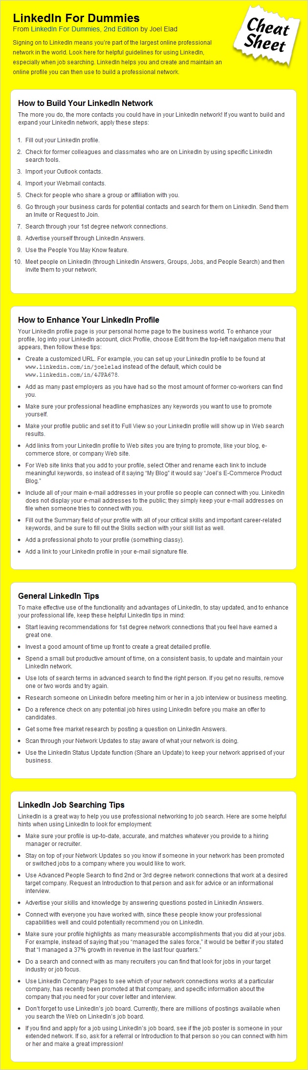 If you are keen on getting started with LinkedIn as your primary networking service, and if you don’t know where to start, just have a look at this LinkedIn Cheat Sheet that Dummies (yeah, the publisher of the “For Dummies” books) created. The sheet consists of pretty much everything you need to know about LinkedIn, and how to use it. It is actually called LinkedIn For Dummies and will totally make you a LinkedIn pro before you know it.