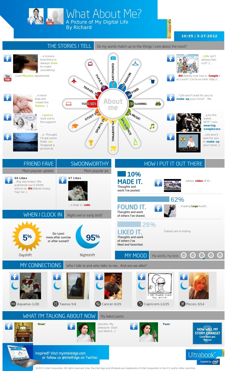 I recently found an interesting (notice that I didn’t say “great”) online service, created by Intel, that actually creates an infographic based on your own online presence. It connects to your Facebook, Twitter and YouTube services (if you allow it to) and mines the data therefrom. It then produces an easy to read infographic of it all that pretty much compiles all the information into sections of different topics. I tried it on my own accounts, which I must say, wasn’t too accurate.