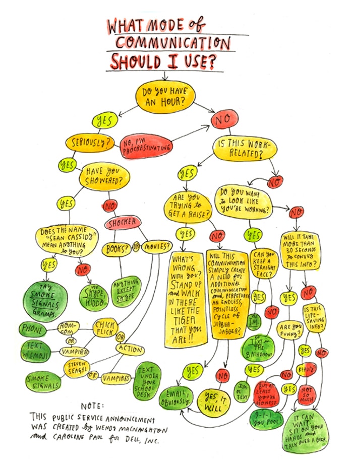 When I think back to how our parent’s dealt with these choices, it seems so much easier. Back then, you either called that person on the phone or went to his or her house to visit. That was it. This flowchart called What Mode Of Communication Should I Use? created by Wendy MacNaughton and Caroline Paul for Dell will give give you a little giggle today. If you want to read more about this topic, you can click over to Modern Communication In A Geek’s Workday [Comic].