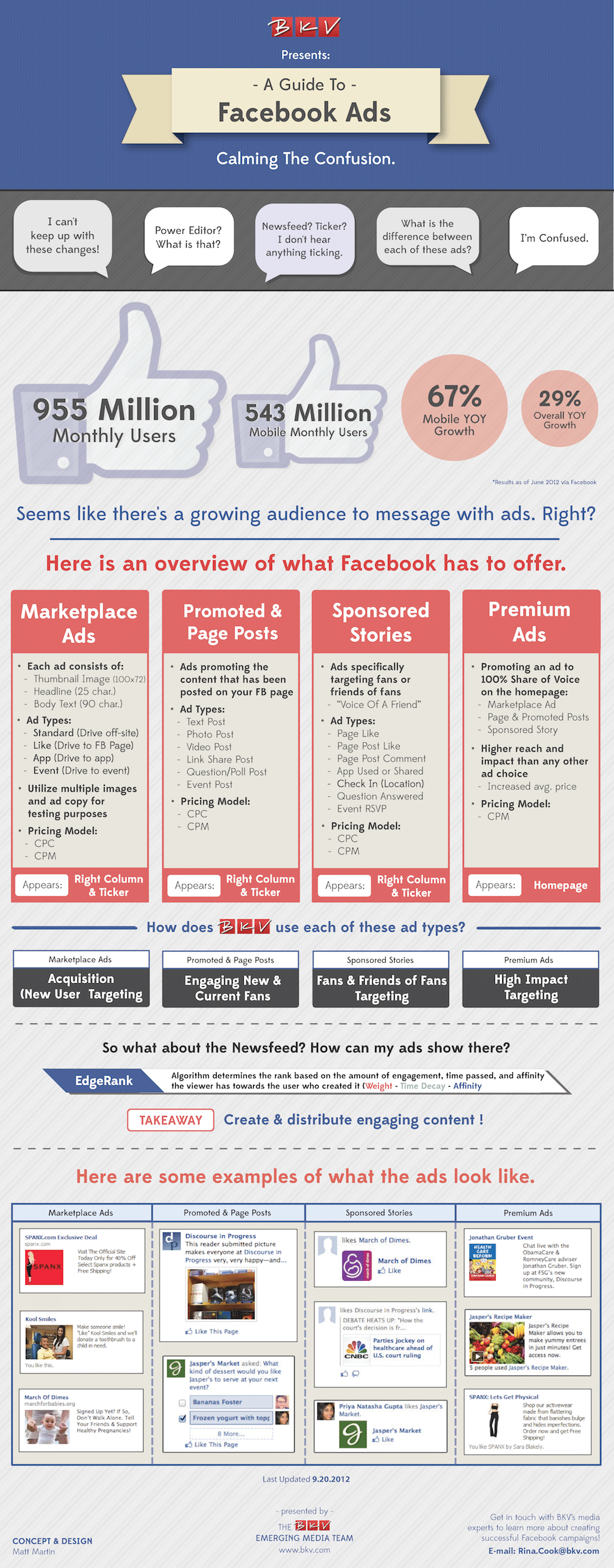 It so happens that BKVsocial put together a really nice and effective infographic (design by Matt Martin), called A Guide To Facebook Ads, which is all about the different advertising options. It says that after having studied it, it will “calm the confusion and provide insight to make you savvy enough to hold your own when discussing the current state of Facebook advertising.