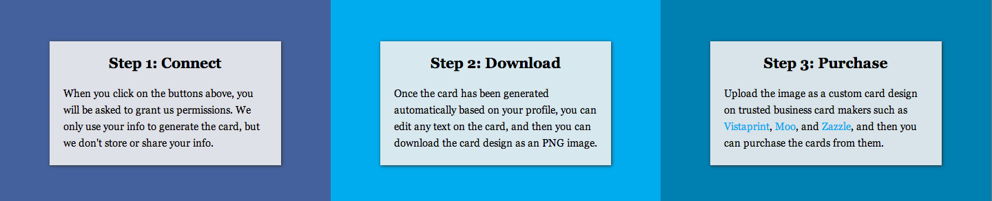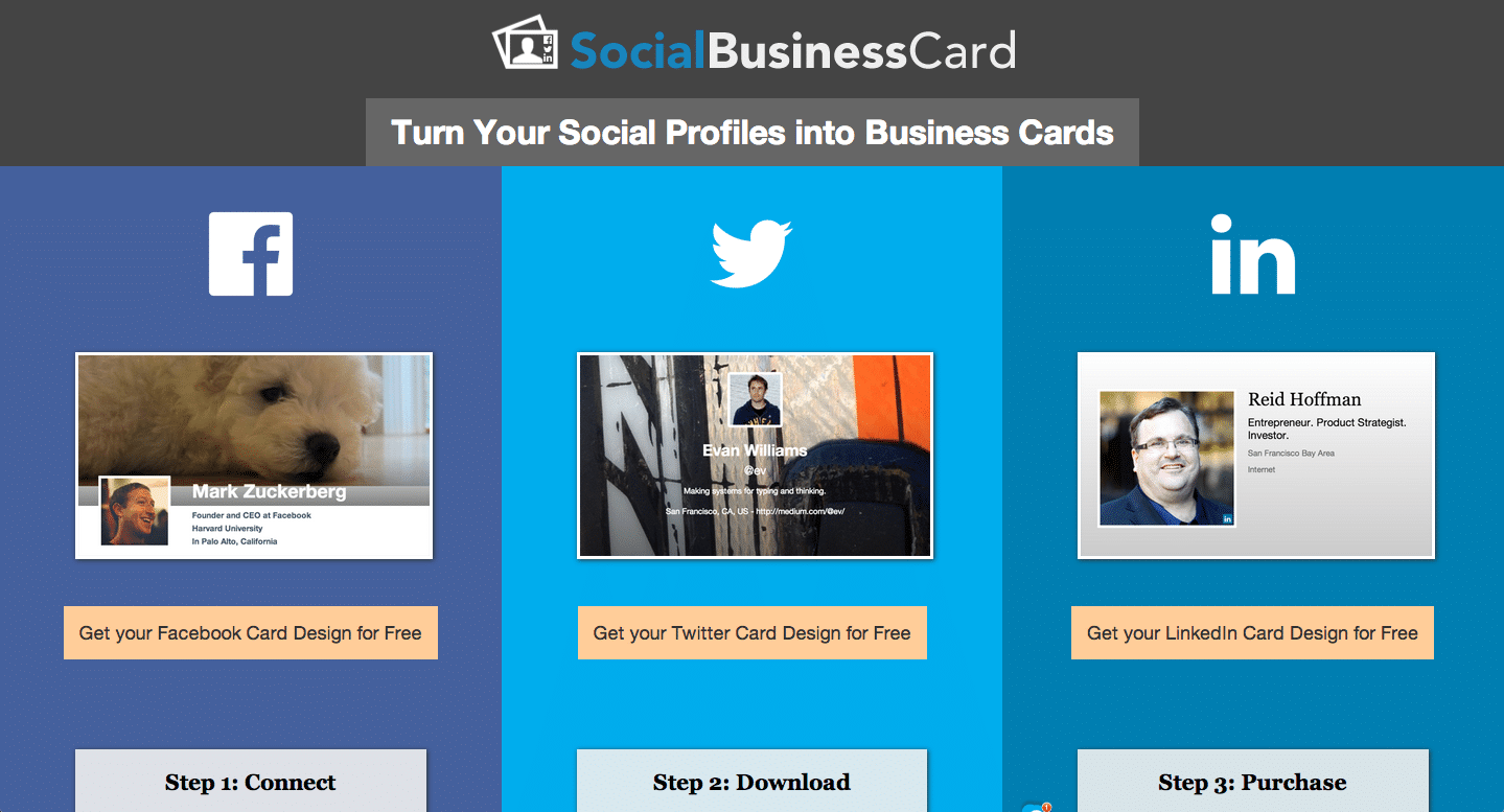 It’s a new service that is pretty unique in its way of gathering information to put on your business card. It actually lets you automatically grab information from Facebook, Twitter or LinkedIn. It’s super fast, and it only requires two clicks and you’re done.