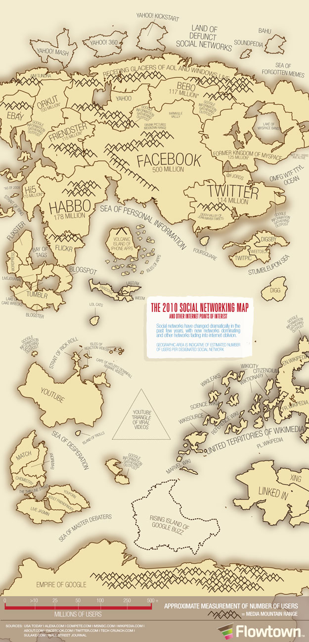 The wonderful people at Flowtown created this fabulous 2010 Social Networking Map. They consulted USA Today, Alexa.com, Compete.com, MSNBC.com, Wikipedia.com, About.com, Facebook.com, Twitter.com, TechCrunch.com, Sulake.com and the Wall Street Journal to gather their stats and relevant information. As you’ll see on the map, each “geographic area is indicative of the estimated number of users per designated social network.” This very creative way to illustrate this concept makes it simple and easy to understand.
