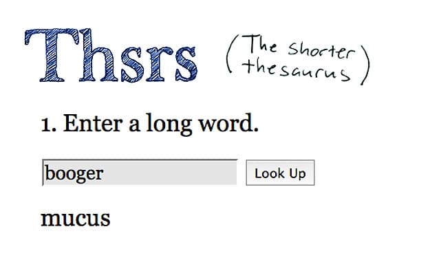 I’ve read that many of the people who consider themselves the “online grammar police” think this site is a bad idea, but why? It’s not like it gives grammatically incorrect words, they are just shorter. I worked the site for several minutes, and it worked well. I even put in the word booger thinking there is no way there is a shorter word for that. It gave me mucus, which is one character shorter. Cute.