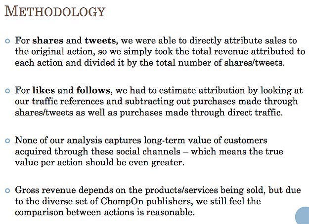 There is just so much ambiguity and ways to go with this. In my opinion, quality is much more important than quantity, and assigning an accurate dollar amount to this might be close to impossible. Social Media Today recently published an article on this same topic. They referenced a company called Chompon who recently did extensive research about this as it relates to their own business. Their findings were absolutely fascinating, and I encourage you to download the PDF of their results. I put a screenshot of some of their results and methodology below for you to check out.