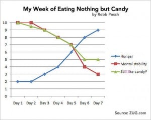 I'm not a big candy eater because I'm not a fan of rotting out my teeth; however, I know a lot of people who love that sweet stuff. Have you ever wondered what it would be like to eat nothing but candy for a whole week? How would it affect your hunger? Would it make you have mood swings and go nu ...