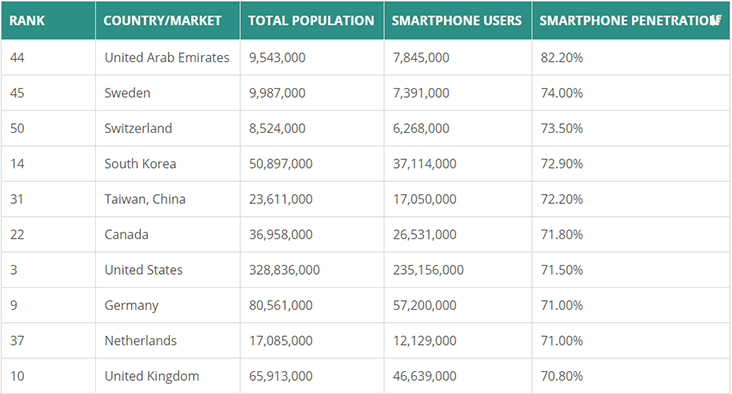 At the other end of the usage spectrum is the United Arab Emirates, with 7.845MM of unique users which represents a hefty 82.2% of smartphone ownership amongst its citizens. Surprisingly, it is Bangladesh where only 5.40% of the population owning smartphones.