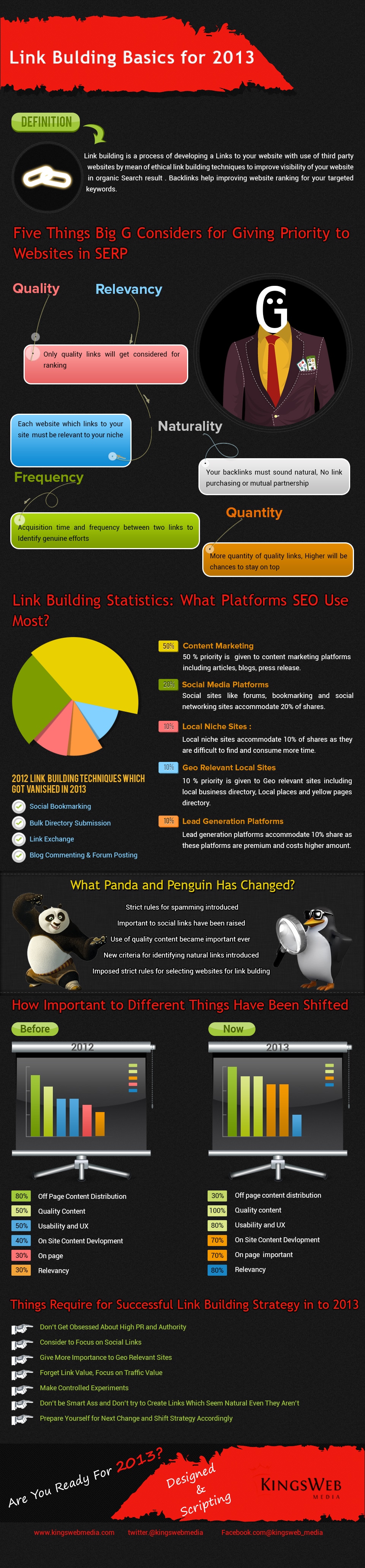 It comes to us as an infographic called Link Building Basics For 2013, and it is presented by KingsWebMedia. It should definitely be used as a link building guide for anyone who is looking to build up a good ranking over at Google and other search engines. Remember when you undertake link building, it is important to make sure you get links from websites that have similar content as yours. Nothing will rank you higher than a popular website’s link to your website which publishes the same type of content as your website. It’s definitely an art, but soon you will get the hang of it and become masterfully skilled at building your linkage. This link building guide is here to help you through that process.