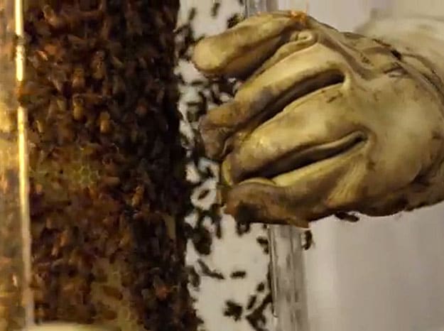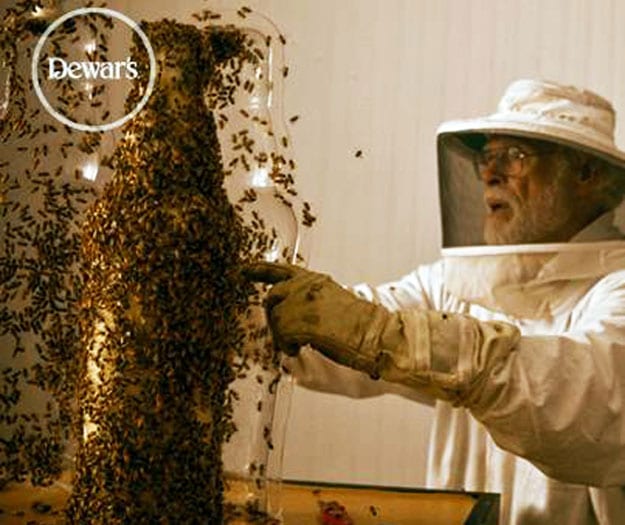 If you watch the video below, you’ll see all these bees in action as they create their masterpiece. I don’t think I would have wanted to be the one in there messing with them while they were hard at work. I know that guy is wearing thick gloves, but still. Imagine getting stung by 80,000 bees. No way! You have to admit, this is a very creative way to promote honey whiskey. It almost makes me want to try it.