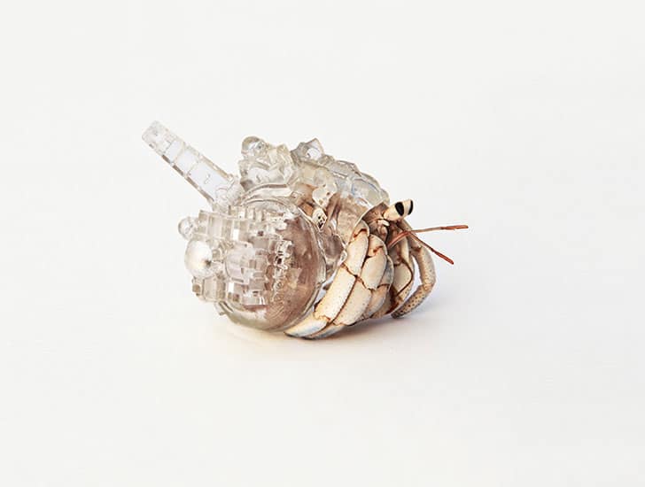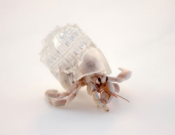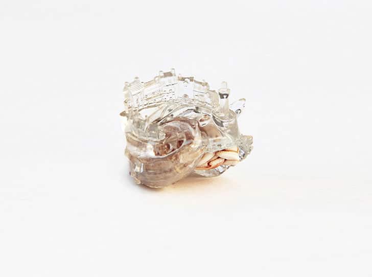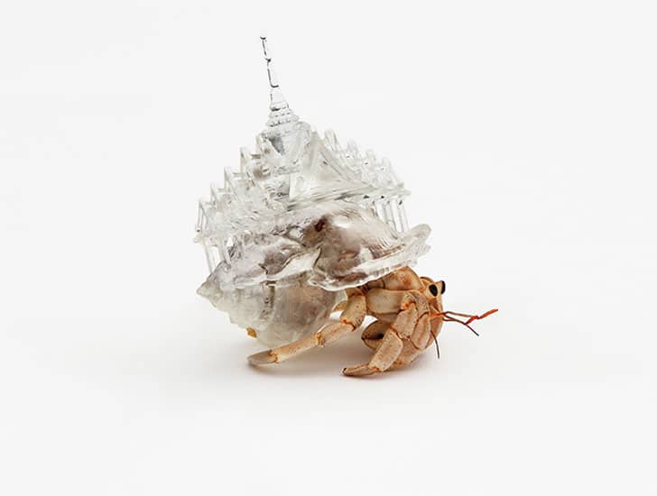 These shells were created by artist Aki Inomata. She made them to offer some very lucky crabs a new home. Each shell was 3D printed in clear plastic, so the hermit crab’s body is visible inside. Aki made these by taking CT scans of existing, abandoned hermit crab shells, which she then changed with CAD software. She then printed them with a rapid prototype system.