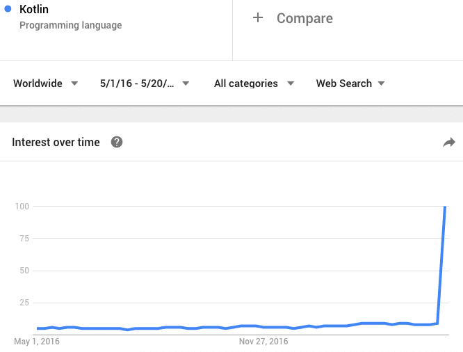 Kotlin was announced an official language for Android development in recent Google I/O held on May 2017. Here’s the graph of Google trend after this announcement.