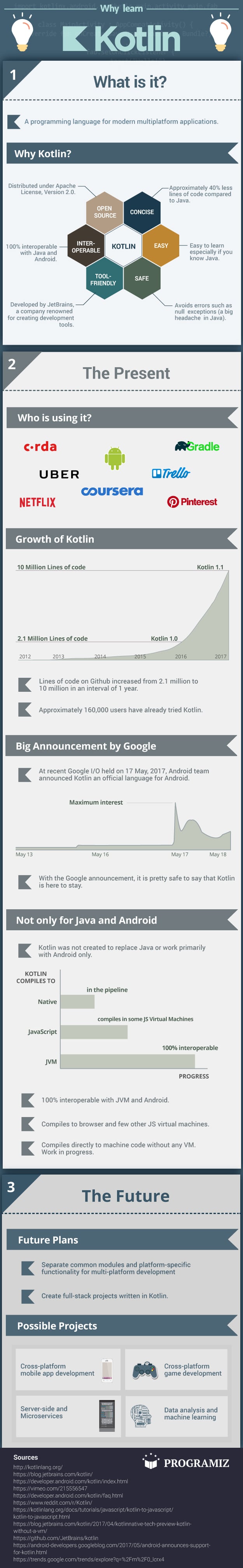 Kotlin is a programming language created by JetBrains for modern multi-platform applications. It is free, safe, concise and interoperable with Java and Android. During recent Google I/O 2017, it was announced an official language for Android apps development.