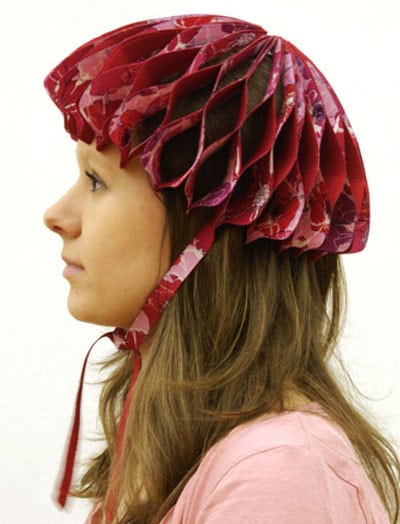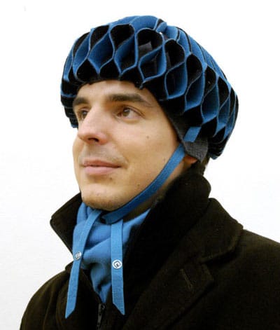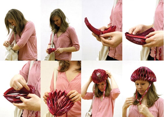 According to http://www.yankodesign.com, “The TopUp Head Protection for cyclists and walkers is an exploration of the honeycomb pattern. The brief was to design a gear that was is light and compact and that could deal with minor bumps and falls. The honeycomb was an obvious choice for its impact resistance and shock absorption qualities.” Unfortunately, this helmet is not available yet. It’s currently a prototype. You may think it looks funny. Go ahead, laugh it up, I’m going to be sporting one of these the moment it becomes available. :)