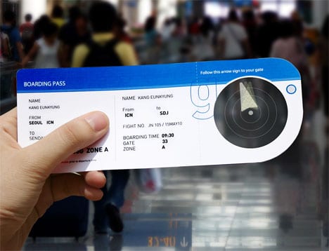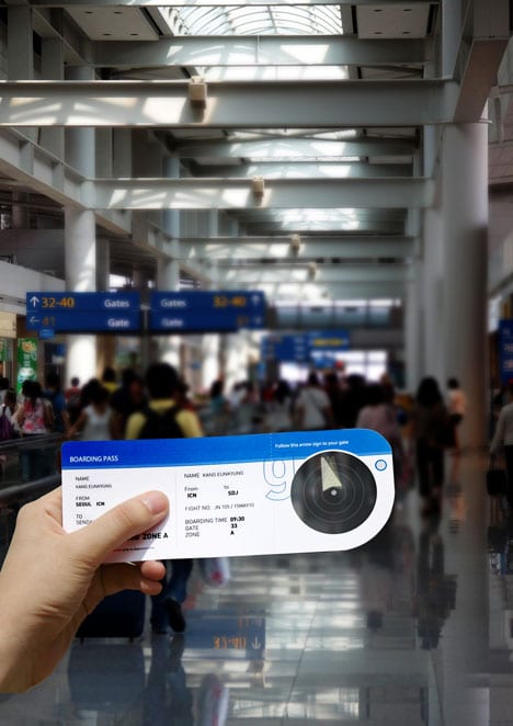 Designers Kang Eun-Kyung and Park Ji-Eun have come up with something as simple as an Airport Compass. The compass itself is incorporated into your boarding ticket, and it will show you the direction to go by using e-paper. The compass is powered by a solid-state thin battery which is flexible and needs very little power to function.