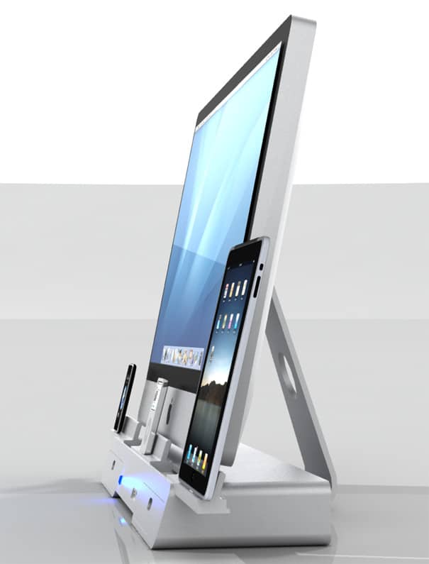 One step in the right direction is definitely designer Yaser Alhamyari’s solution called “The Docking and Storage Base“. It’s a tray that you position underneath your display (Apple of course) which will enable you to connect three different Apple gadgets at once. And, it looks awesome at the same time. You can now, as a geek, plug in those touch screens right beside the humongous display or iMac that you’re always working on.