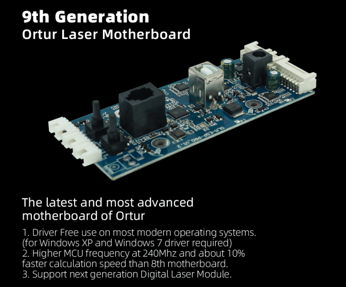 - The 9th Generation Ortur 32Bits Motherboard (OLM-ESP-PRO-V1.2), the latest and most advanced motherboard of Ortur, arithmetic speed is faster, the operation is smoother, the engraving & cutting precision is higher, the Grayscale printing performance is enhanced.