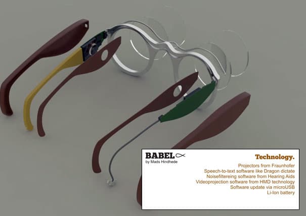 The glasses, named “BabelFisk” have two microphones that listen to any speech from the outside world. It translates it, and texts it on the screen (glasses) in front of the person wearing the glasses. The two microphones even read from what direction the chatter comes from and prints it out accordingly. Also incorporated is a flash memory that can record any speech, and even the translated text, so that you can go back and review it at a later time. It’s not only great for the hearing impaired, but also for people who want to make it easier for themselves during lectures and keynotes since it will record everything that is being said. It’s stunningly simple, ultimately useful and awesome. This device should be awarded many times over. Brilliant!
