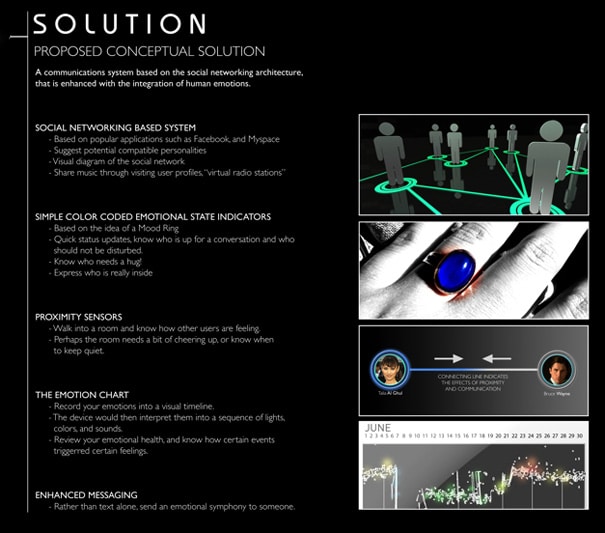 In a sponsored project held by RIM BlackBerry at the Art Center College of Design Kiki Tang & Daniel Yoon decided to have a go at something different. It’s a new and fresh take on the user interface that uses human emotions as a base. It incorporates a finger ring that senses the emotions of the person using the phone, and it reacts accordingly.
