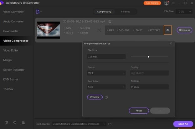 Video compression tools are great that help store large-sized videos without having a significant impact on quality. UniConverter can achieve a satisfactory result and doubles as a video converter, video editor, and so much more, making it the perfect tool for this job.