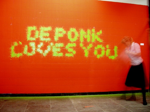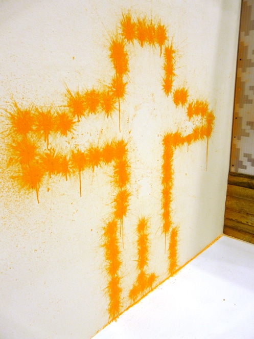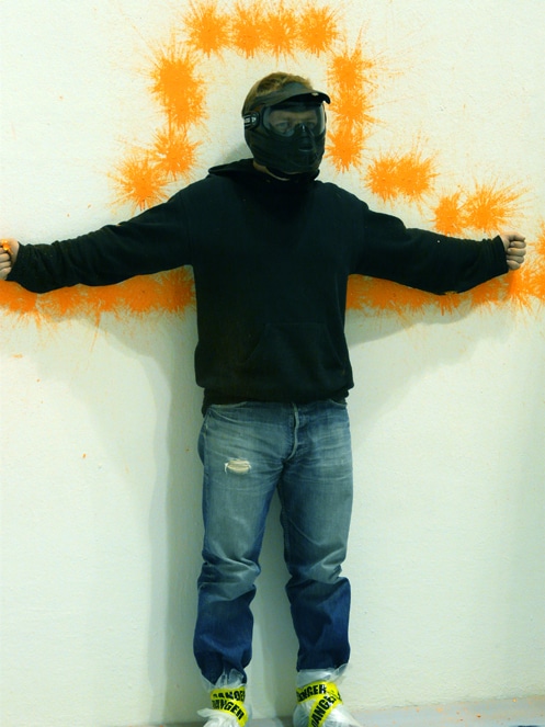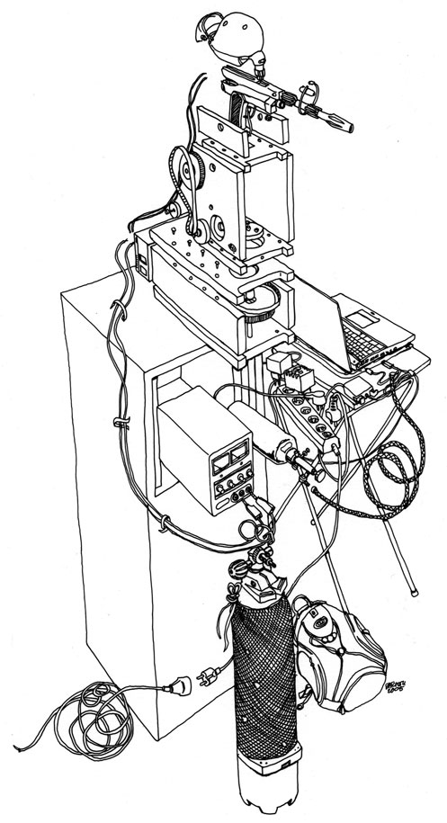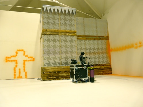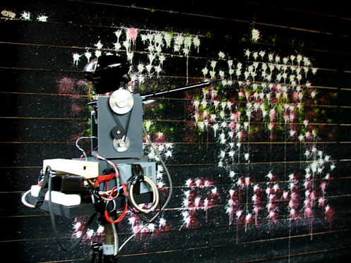 Benjamin Gaulon – “The PrintBall is a graffiti Robot. It works like a giant Ink-Jet printer using a PaintBall Gun as print-head. The PaintBall gun is mounted on a custom made pan & tilt unit, which is connected to a software programmed with Max/Msp: PrintWare 6.0 (G.M.L compatible).