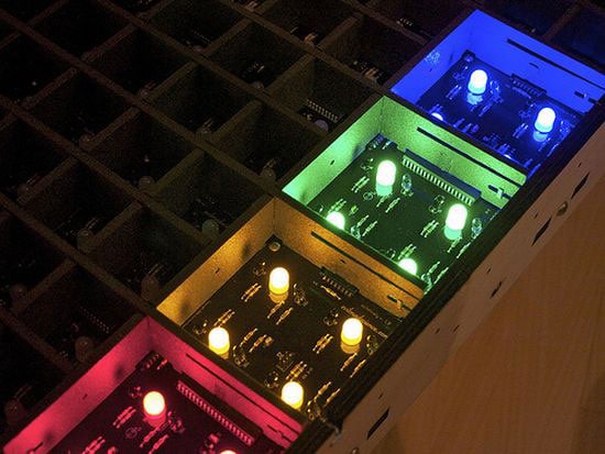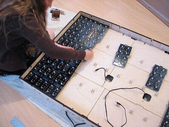 According to makezine, “Each group of 8 lights has its own circuit board and ATmega164P microcontroller, and infrared proximity sensors tell it when someone touches the square. Each board has to be programmed individually, 44 in all!”