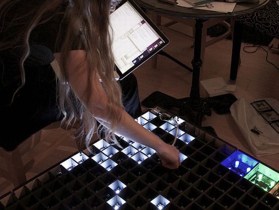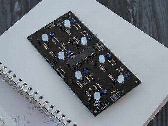 According to makezine, “Each group of 8 lights has its own circuit board and ATmega164P microcontroller, and infrared proximity sensors tell it when someone touches the square. Each board has to be programmed individually, 44 in all!”