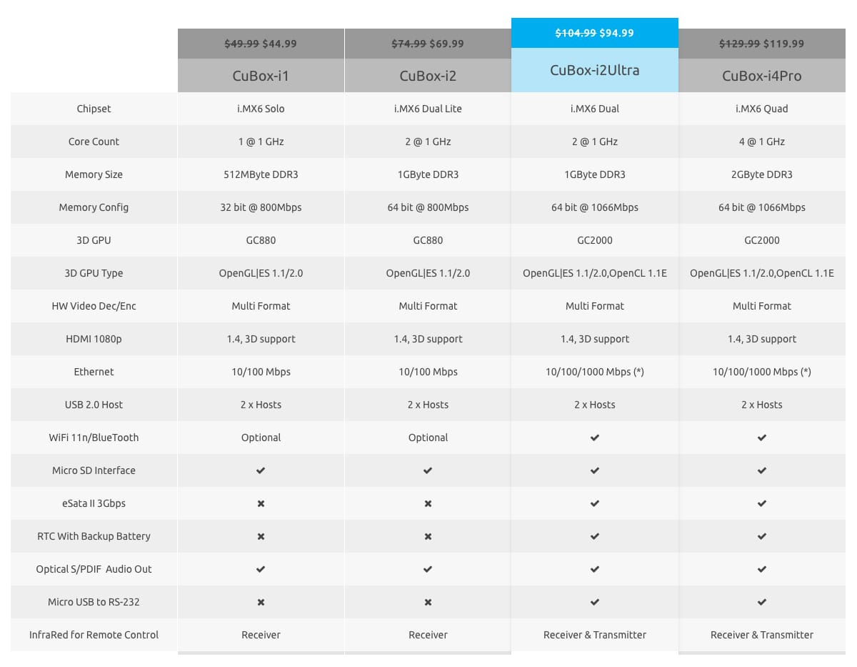 So let’s take a look at the specs of the CuBox and see if it has any chance of dethroning the Raspberry Pi as the smallest most powerful pocket computer on the market. There are actually 4 tiers of the CuBox pocket computer, and they are the CuBox-i1, CuBox-i2, CuBox-i2Ultra and CuBox-i4Pro, seemingly after the number of core processors you want it to have incorporated. Make sure you understand that with more cores in your CuBox, the price increases significantly. It is still a super cheap pocket computer however, it will cost you to be cool. Have a look at the specs as well and compare it to those of the Raspberry Pi and you’ll see that it is quite capable of competing with it.