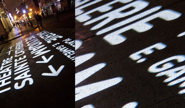 Some designers behind the very successful Canadian Quartier Des Spectacles have come up with a simple yet über technological solution that could potentially change how we read signs. With a few projectors positioned on the side of the street, they project directions, stop or walk signs, and even event signs that will show you the way to get you there. They can even animate the images that are projected on the street to make it feel more interactive.