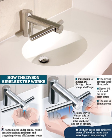 Did you know the way we wash our hands could be improved? I never thought about it until James Dyson introduced his Dyson Airblade Tap yesterday, but now that I think about it, he’s right. We wash our hands at a sink, and then we walk over to a towel or a hand dryer in a different location to dry them. Meanwhile, we drip water on the floor when walking from one place to the next. Describing the process this way even sounds kind of gross.