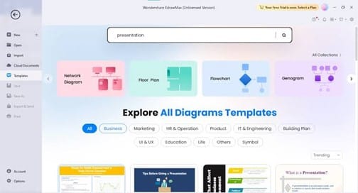 As you start up the program, you will be greeted by a library of templates that will help you to work with ease and at a fast pace. EdrawMax AI simplifies the process of project planning and management with its user-friendly tools for creating timelines, flowcharts, and many more.