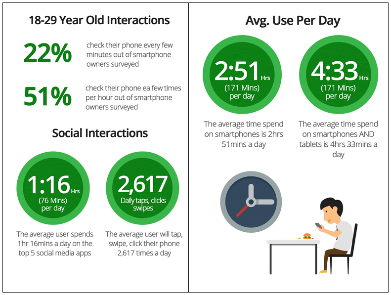 Let’s go through the smartphone usage numbers, shall we? – According to the phone addiction study by BankMyCell, an average of 171 minutes (2hrs 51 minutes) was spent on smartphones per day. When added to tablet usage, the average time totaled 261 minutes or 4hrs and 33 minutes in a day.