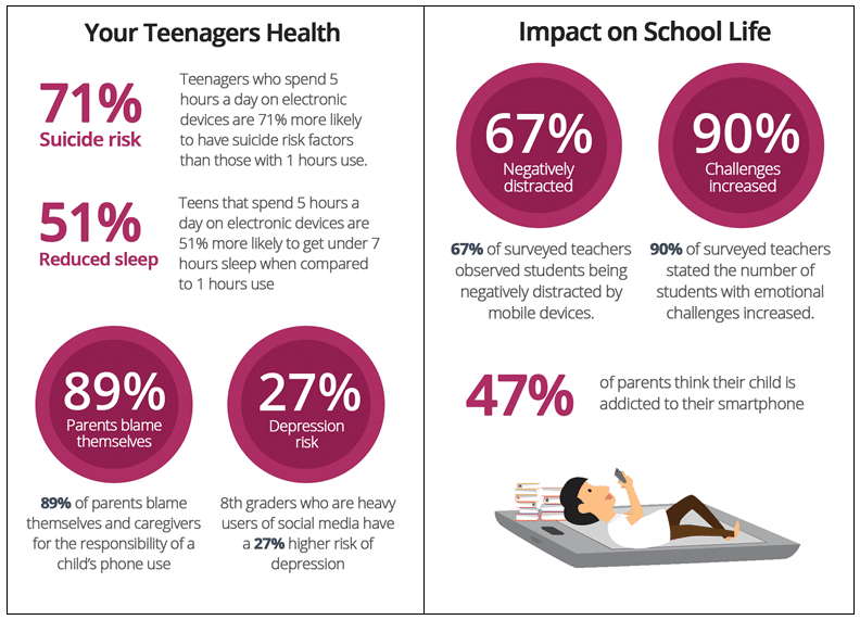When it comes to the teenagers, there is a worrying trend. An estimated 71% of teens, spending more than five hours on their mobiles, are at risk of committing suicide.