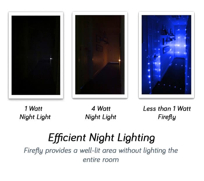 As you can see in the pictures, the lasers project for long distances, so there is no more wasted energy or inefficient lighting. Firefly lights are made with 99.6% recyclable materials, and they only use 0.4 watts of power. These lamps are called firefly lights since they make it look like there is a bunch of fireflies in the room. The lamp itself is small and portable, so you can take it with you anywhere you need a light source.