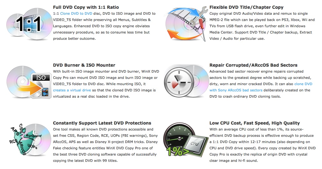 In case you are unfamiliar with WinX DVD Copy Pro, it’s a backup software for your DVDs. It comes with 9 advanced copy modes, and below you will see an overview with 6 of the primary features. With this software, you’ll be able to clone DVD to DVD disc, ISO image and VIDEO_TS folder while preserving all menus, subtitles and languages. It’s an ideal solution to protect all your personal DVDs from scratch or damage.