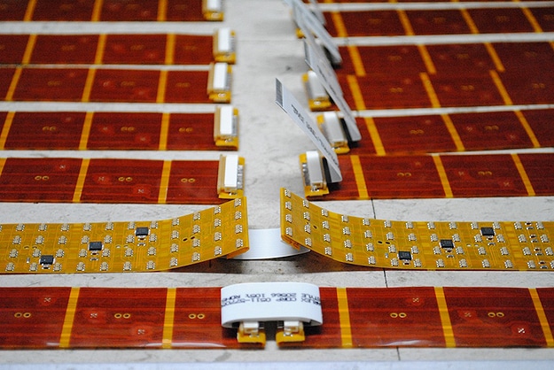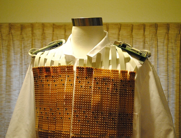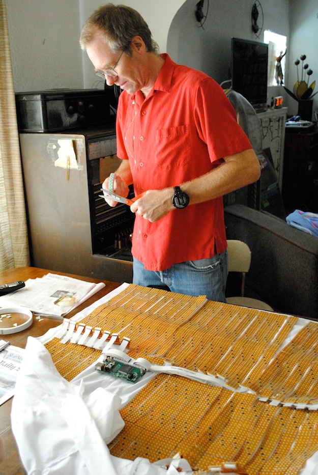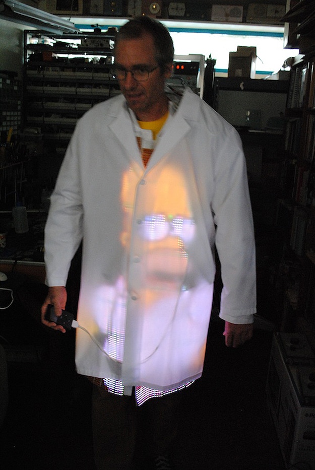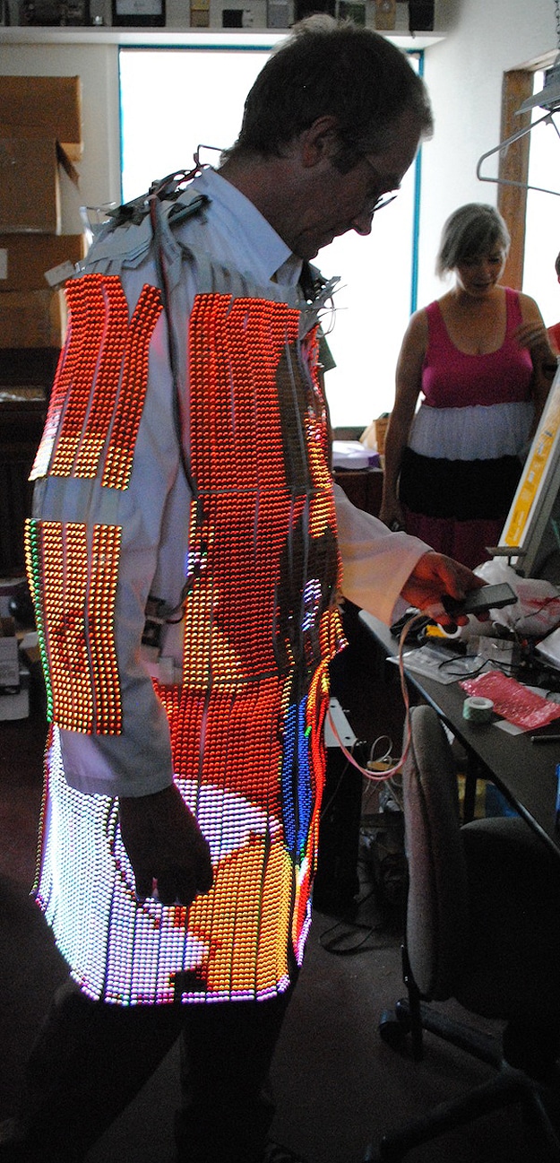 Dave just built this coat to wear to Burning Man (an annual art event that you have to apparently see to believe). As you see, the display wraps all the way around the coat, and is even on the sleeves. It’s all powered by a 12V battery, and there are circuit boards on the shoulder and hips. This build took David 6 months and $20,000 to make. I wonder if it’s heavy and uncomfortable to wear. I don’t care if it is, I’d want to try it on anyway! You can click over to cathodecorner to get all the geeky details about how he did it.