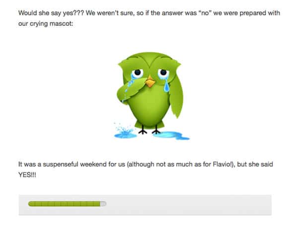 If you are familiar with Duolingo, you know that through a series of lessons, you can use this app to learn another language. The people at Duolingo set up a special lesson just for Flavio’s girlfriend to see the next time she logged in.