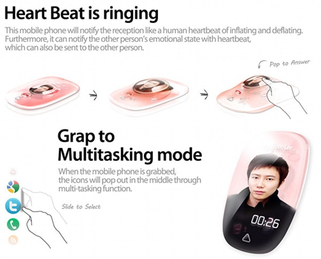 Just when you thought that relationship couldn’t get any more intense, the Heartbeat Mobile Phone concept comes into the mix. Korean designer Sang Hoon Lee sees an inflating and deflating phone as an alternative method of receiving calls. On his website, he adds that “perhaps a mobile phone will soon become one’s second avatar to express the person.” The concept explores the idea of being able to detect the emotional state of the person calling. You simply ‘pop’ the inflated phone to answer! In a similar way to Apple’s dock icons, the icons on the Heartbeat Phone will increase in size when you hover over them.