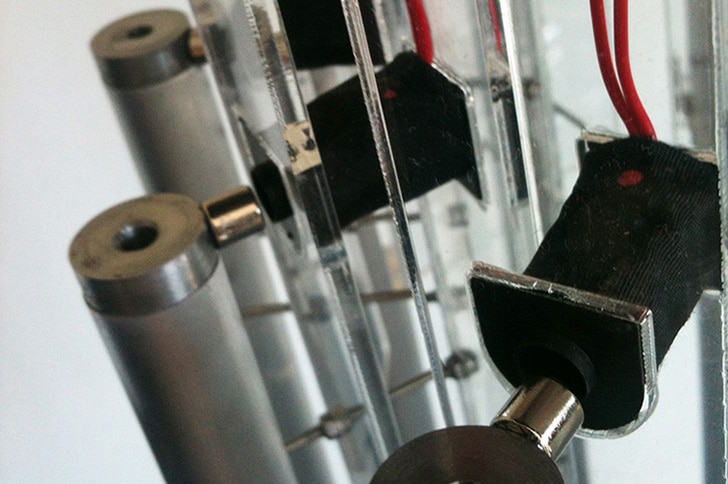 The sound is generated by electromagnets oscillating a series of tuned aluminum tubes at their resonant frequencies. The 12 electromagnets are powered by driver boards controlled by an x-OSC. The x-OSC allows us to generate PWM outputs for the electromagnets based on OSC commands sent over wi-fi. An application written in Processing running on a computer sends OSC instructions to the solar wind chime, telling it which chimes to oscillate at which frequencies.