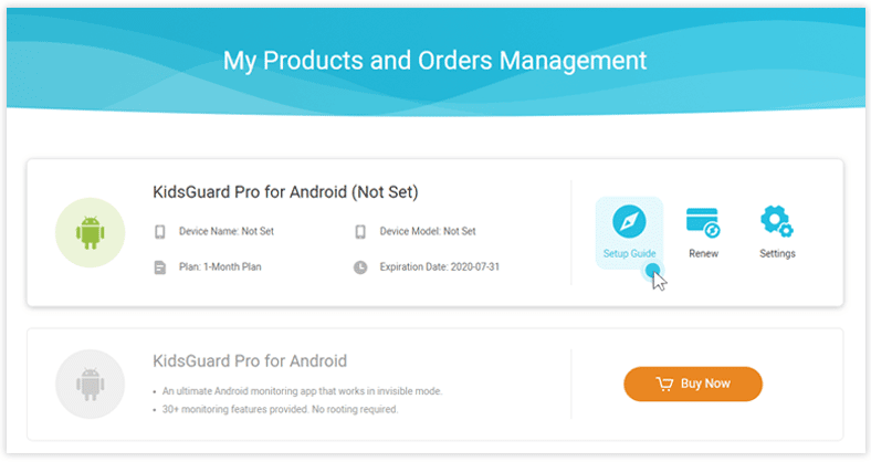 Sign up a KidsGuard Pro account first, after that, you’ll be led to select a plan to activate the monitoring features. There are 3 pricing plans available to choose, and the 1-year plan could be the most cost-effective for only $8.32 per month. But if you’re not sure whether it’s the perfect tool for you, 1-month plan for 29.95 per month is rather great though. When you finishing purchasing the plan, the page will automatically turn to “My Products”, and you can find “Setup Guide” to help you better learn the rest configurations.