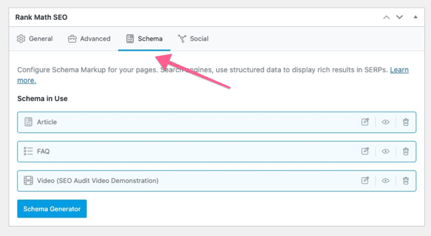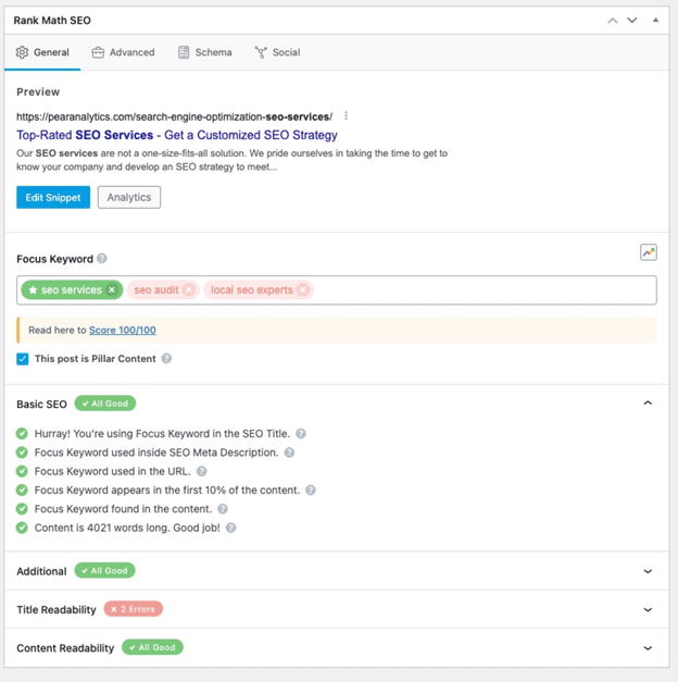 A great feature is the ability to analyze a page for multiple keywords. For instance, if I want to rank for “seo san antonio” and “seo success metrics” on the same page, Rank Math can graded the page for both variations. With this, you can tweak your content, titles, tags and other elements to increase the scores.