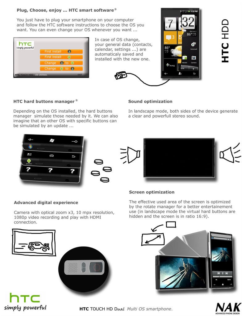 However, you might not have to choose anymore, at least if NAK Design‘s dream comes true. He designed a concept HTC cell phone that will run multiple operating systems on it. My first thought was why hasn’t anyone else thought of this before? Of course, there have been thoughts about creating something similar. Companies just want their creations for themselves, and they don’t want to sponsor their competition’s market. Simple as that. Or at least I think it is…