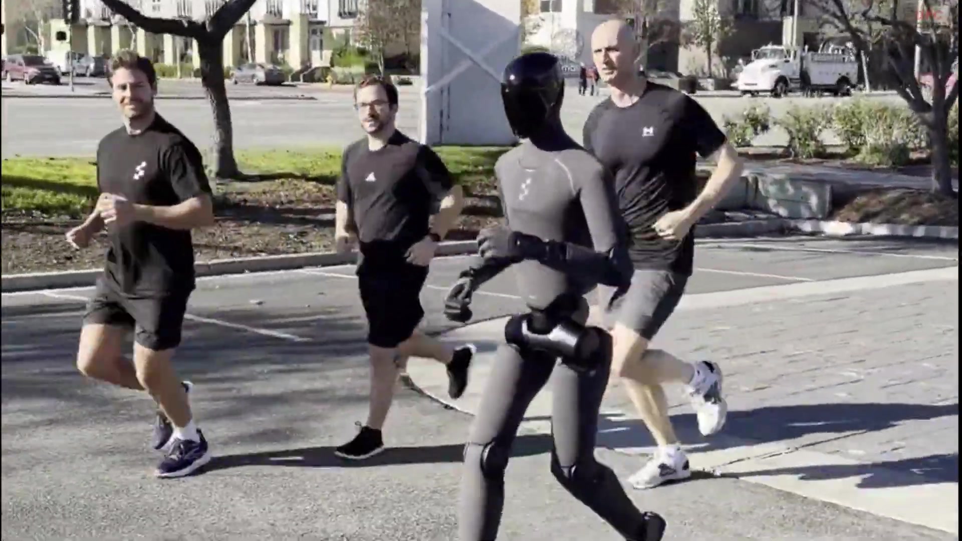 Humanoid robot running is visible early in the footage: stride length adapts, balance persists when both feet are off the ground, and the torso stays controlled. Those cues make the motion feel human rather than theatrical, and they hint at a real change in where robots can safely operate.