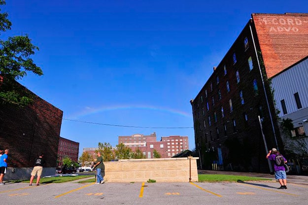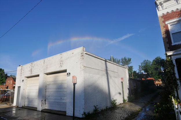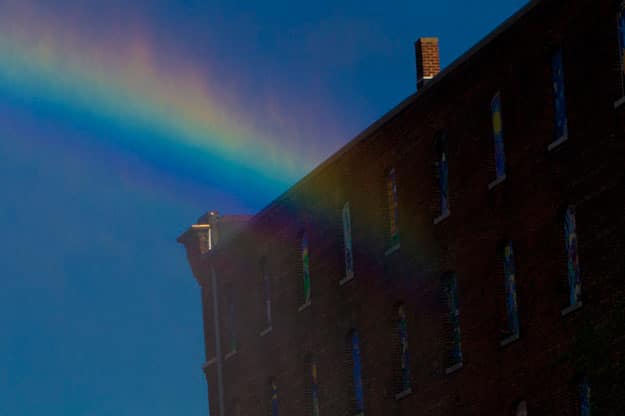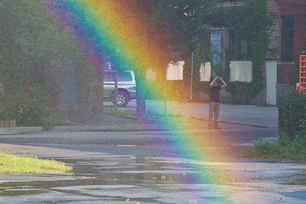 I’m very excited to add another rainbow article to the mix, and this one makes me smile so much! Michael Jones McKean created a solar-powered machine that makes rainbows out of natural materials. He’s been practicing his technique for several years, and from the looks of it, he’s figured it out. For this “Rainbow Project” he uses recycled rainwater, an intricate irrigation system and, of course, the power of the sun. On his website he describes the 80 foot wide/30 foot tall rainbow over his studio building (4th picture below) by saying, “It’s made using sunlight and water supplied by a series of pumps, hoses and nozzles. The rainbow used 80 gallons of water recaptured and continuously re-circulated by way of the building’s water/gutter system.”