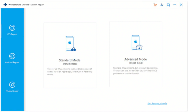 - Step 2: You will get two options, Standard Mode and Advanced Mode. You have to choose the standard mode for iOS system recovery.