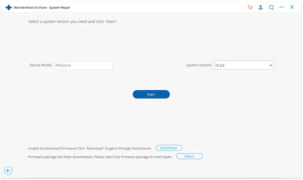 - Step 3: A popup window will open where you need to provide the correct version of your iOS and download the firmware. After providing the correct details, you should proceed with the “Start” button.