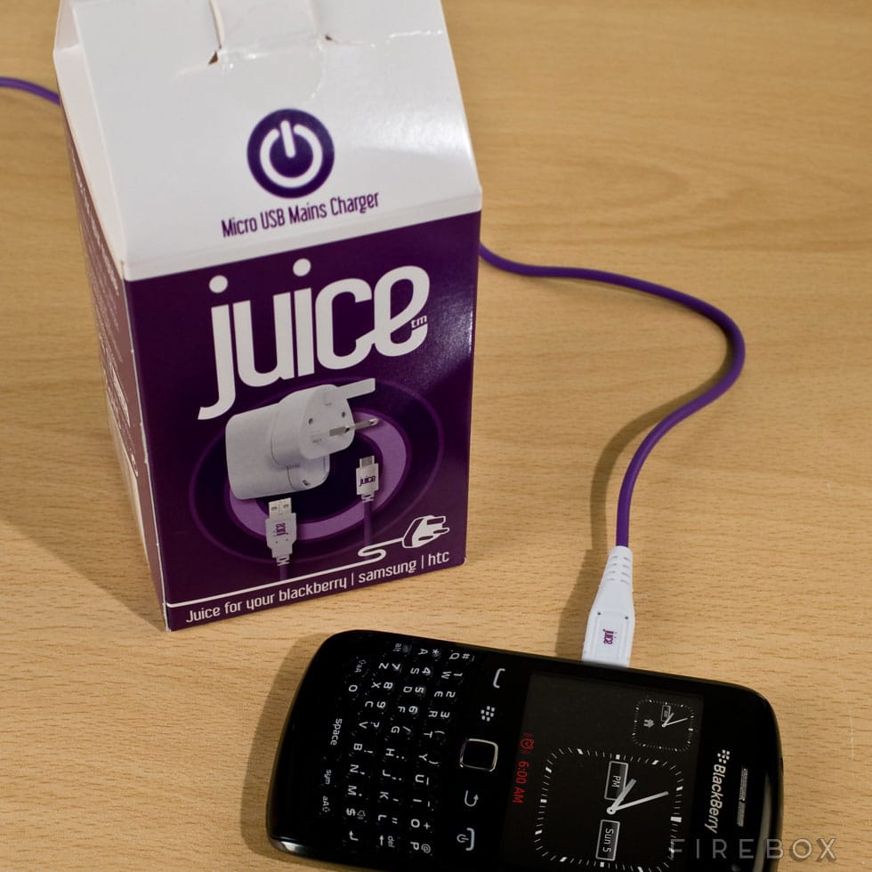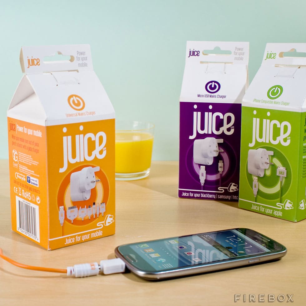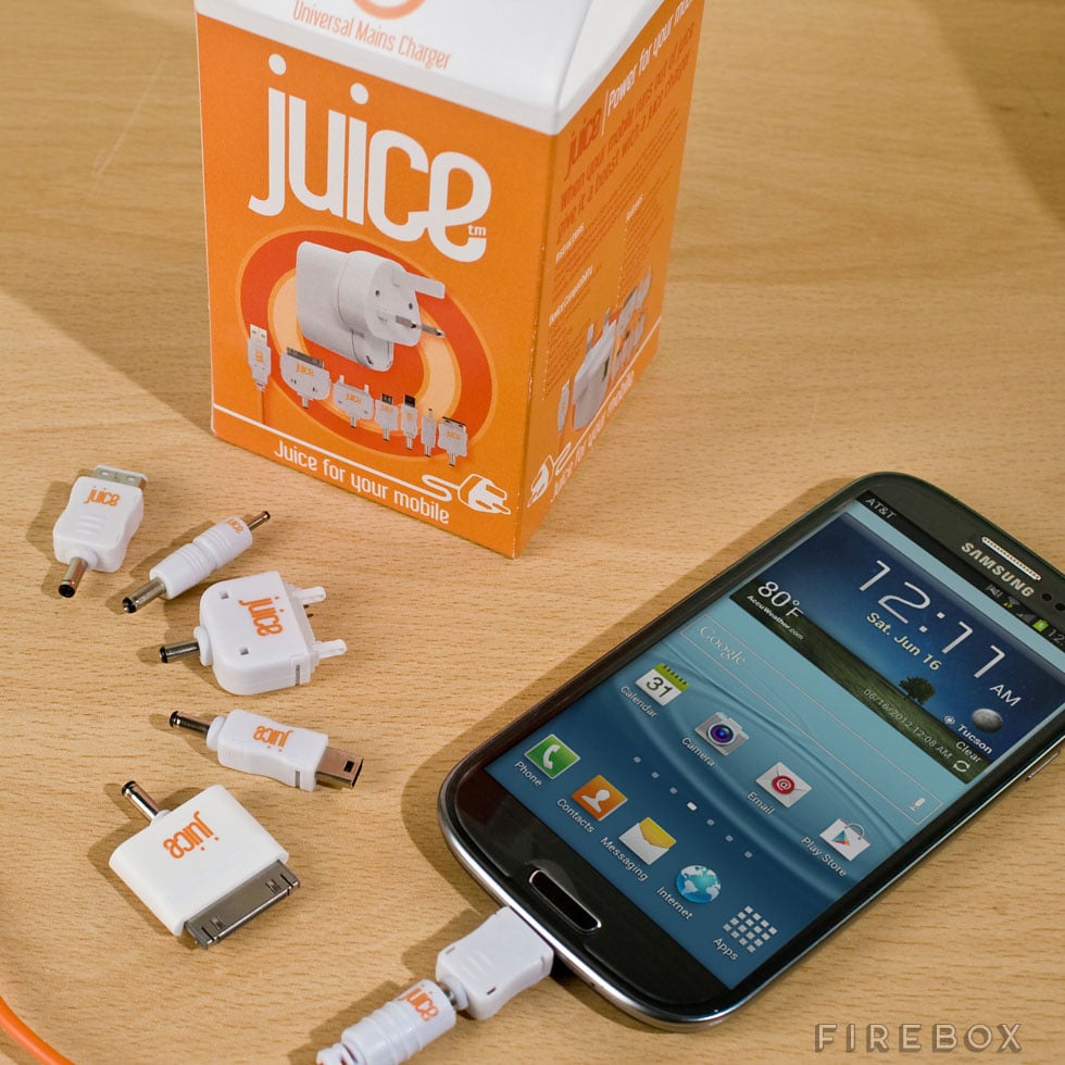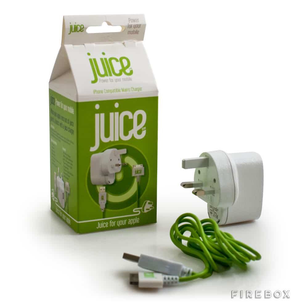 These Juice Chargers, which sell here on Firebox, come in three tasty flavors. You can choose from apple juice (iPhone), blackberry juice (micro USB) or orange juice (universal – iPhone, Blackberry, mini USB, Sony Ericsson K750, Nokia N70 and Samsung G600). Each box contains several sturdy, compact and portable charging adapters for your devices.